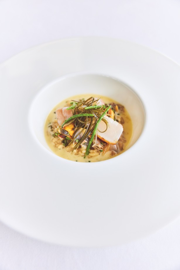 Die gewürfelten Jakobsmuscheln und die Miesmuscheln zusammen mit den Salicornes und Kombu-Algen im Risotto erwärmen, die marinierten Fjordshrimps auf das Risotto setzen und die Dashi Beurre Blanc um das Risotto herum angießen.