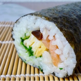 Die fertige Rolle in gleich große Stücke schneiden und mit Shimousa Sojasauce oder Holzfassgeit Sojasauce servieren.