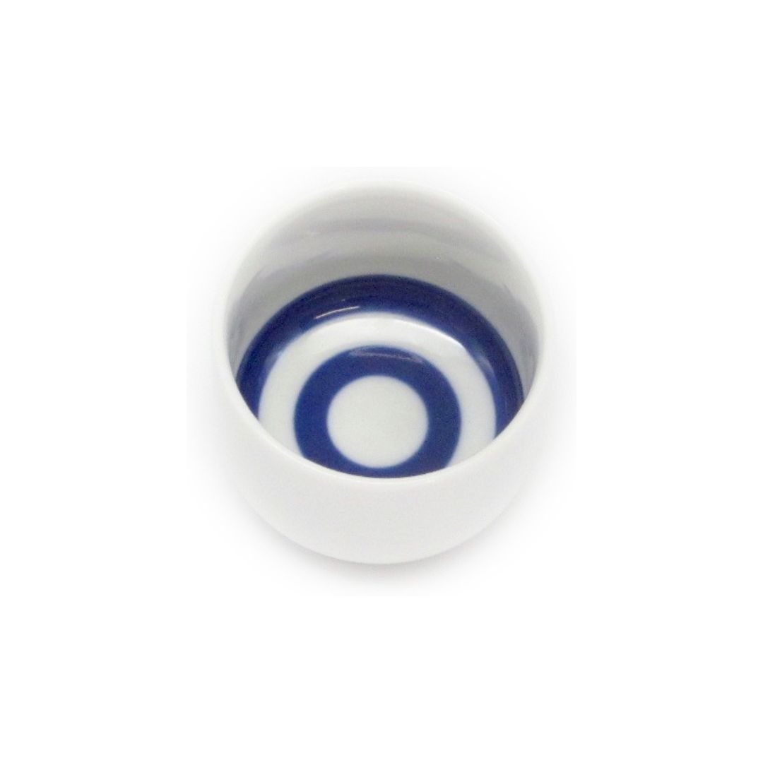 Eine weißer Keramikbecher mit blauen konzentrischen Kreisen zur Beurteilung von Klarheit und Farbe eines Sakes.